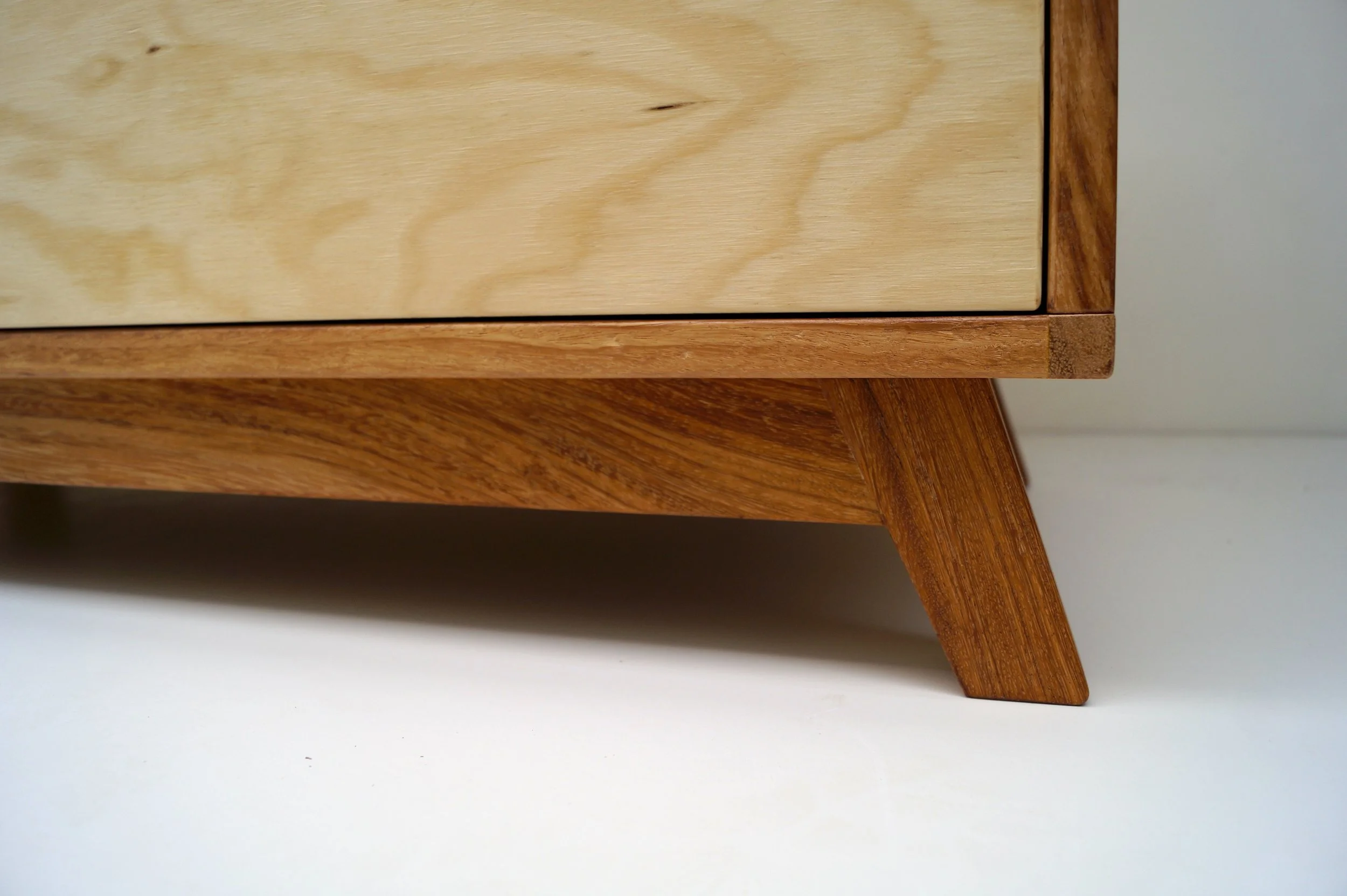 Een commode is een meubelstuk dat heel intensief gebruikt wordt. Stevigheid en functionaliteit zijn dus heel belangrijk, maar er is altijd ruimte in materiaalgebruik en details om er een uniek ontwerp van te maken. In dit geval door pools grenen multiplex te combineren met massief hout, en door de veiligheidsrand een mooie curve te geven.